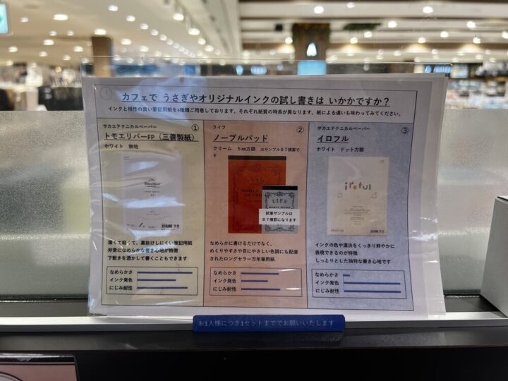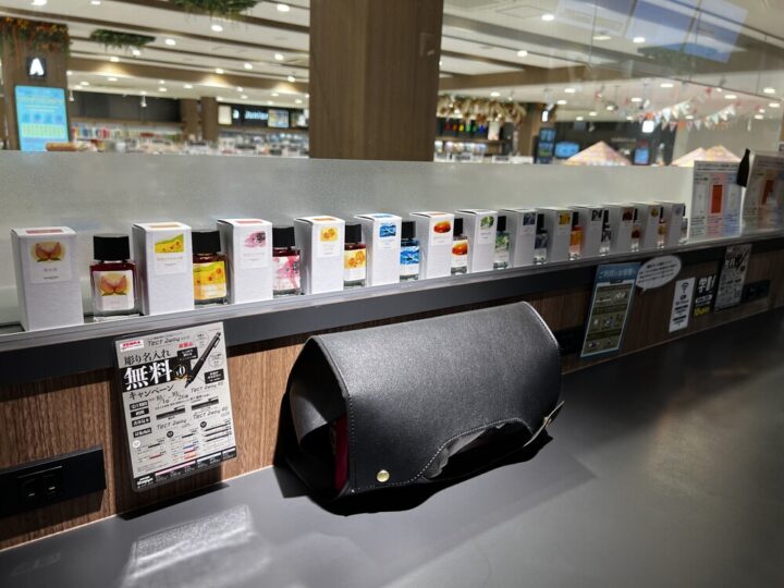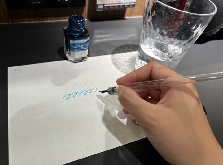 水と専用のつけペンが用意されていて、いろいろなインクを試すことができるので、インク好きにはたまりません!お気に入りの色が見つかったらすぐ買えるのもうれしいですよね。