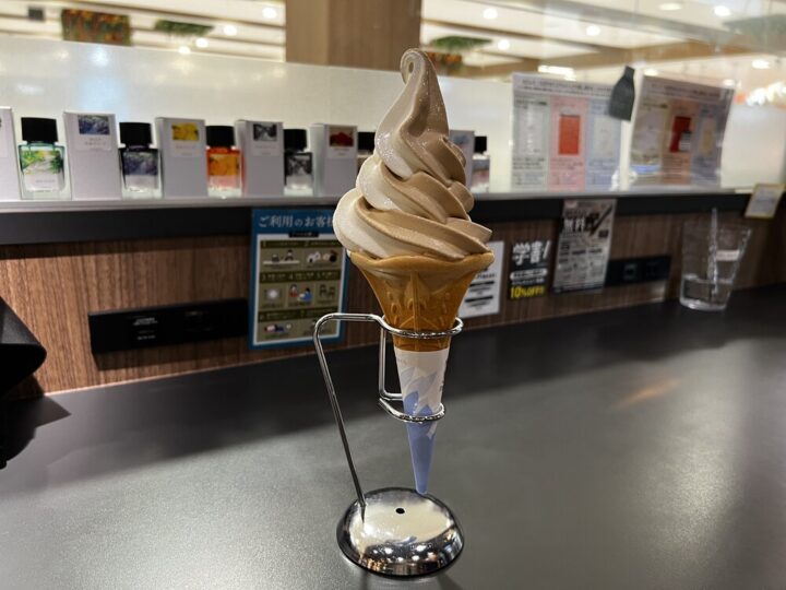 カフェではソフトクリームのほか、ワッフルやパニーニなどの軽食やドリンクメニューなど60種類があり、文具専門店の中にあるカフェとは思えない充実ぶりです!