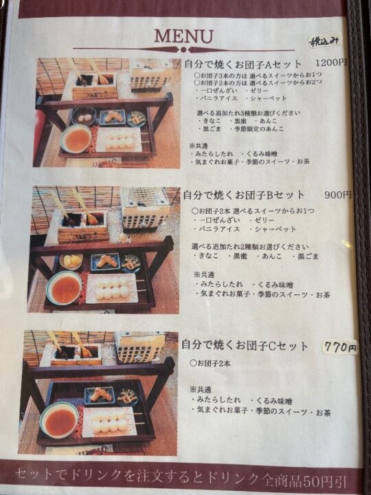 自分で焼くお団子セット以外にも、すでに焼きあがった状態のお団子のセットや、お団子単品のメニューも!