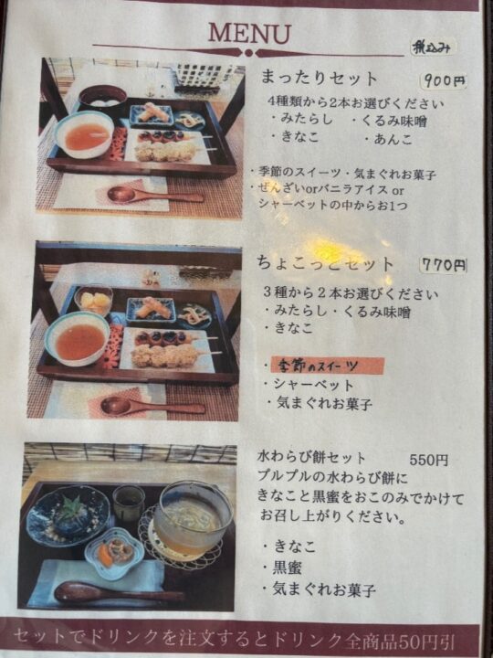 ・選べる追加たれ…きな粉、黒蜜、あんこ、黒ゴマ から3種類選択
