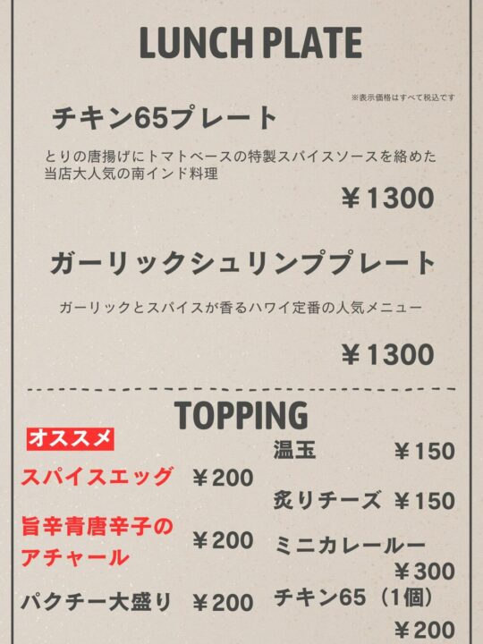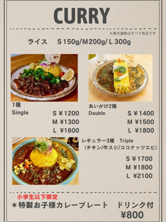 レギュラーメニューは「チキンカレー🌶️🌶️」「牛スジカレー🌶️🌶️🌶️」「ココナッツエビカレー🌶️」の3種類です😳(たまに限定カレーもあるかも・・!)