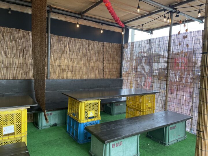 こちらは牡蠣小屋の雰囲気を感じられるテラス席!裸電球の灯りが心地よく、外の空気を感じながらちょっぴり非日常を味わえそうです😊