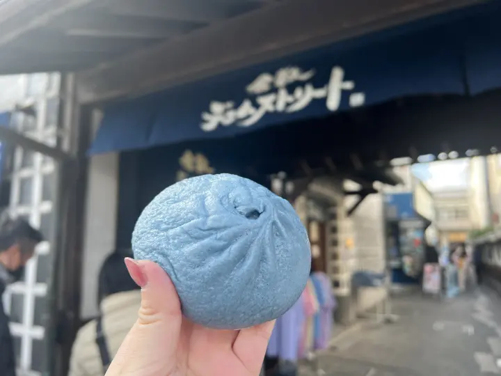こちらは、お店の名物「デニムまん」。青い皮がインパクトあり、SNS映えも💙このほか、デニムソフトやデニムバーガーもあるので、ぜひ食べてみてくださいね~!