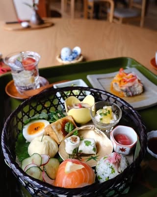 籠盛りには、てまり寿司が付いている他、旬の野菜を使った副菜がたっぷりと盛り付けられていますよ~!