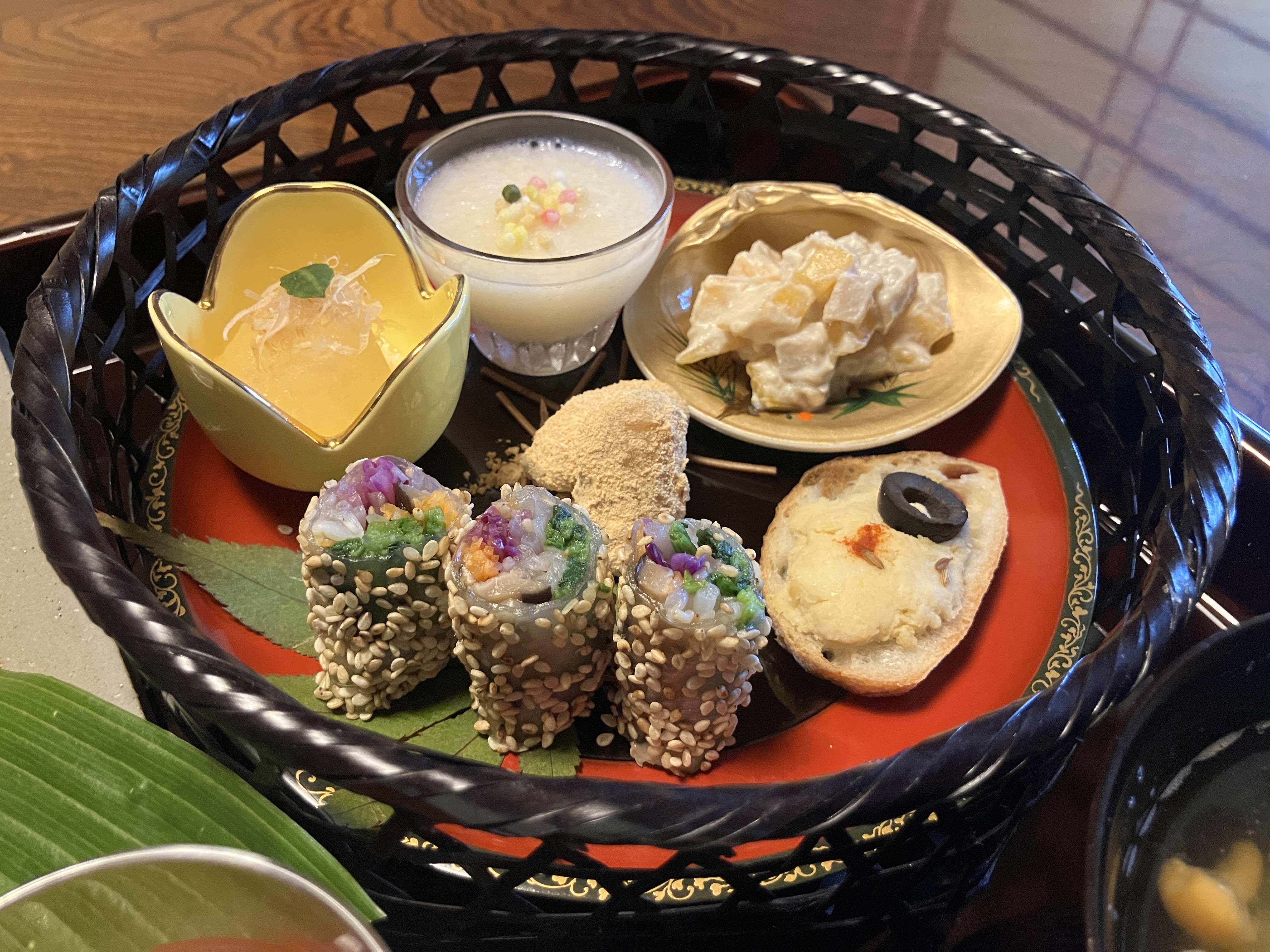 盛り籠にはこだわりが詰まった副菜が勢ぞろい!秋が旬の柿や冬瓜を使ったものや、イタリアン要素を取り入れたものなど、たくさんの小鉢が付いています。✨