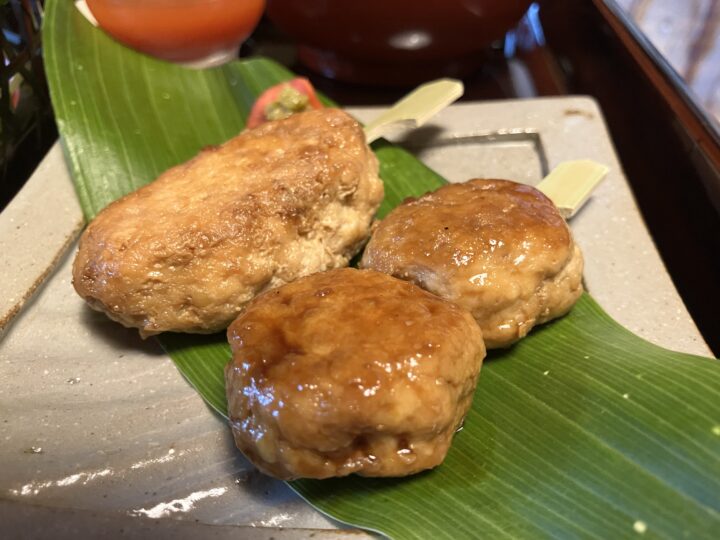 お肉料理にはつくねが2本ついています。鶏肉にチーズやえのきを混ぜ合わせているのが美味しさのポイント!💡