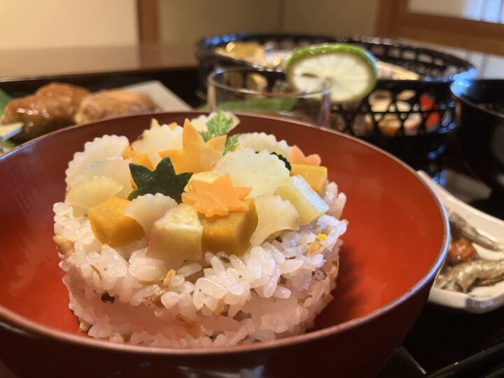 ご飯の上には、モミジやイチョウの形をした野菜が飾られています。🍁