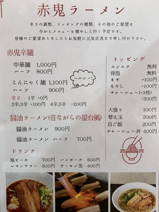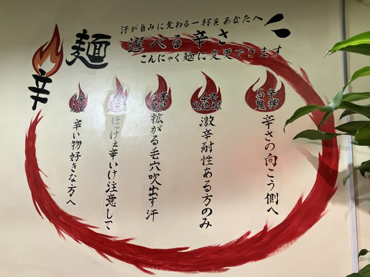 お店の看板メニュー「赤鬼辛麺」は、注文時に辛さを選ぶことができます。辛さごとにキャッチフレーズが書いているのですが、5段階のどれも気になりますよね😲