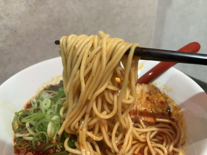 麺は中華麺で、スープがしっかり絡んで旨み倍増!スープのベースとして入っている刻みトウガラシもアクセントになっています。