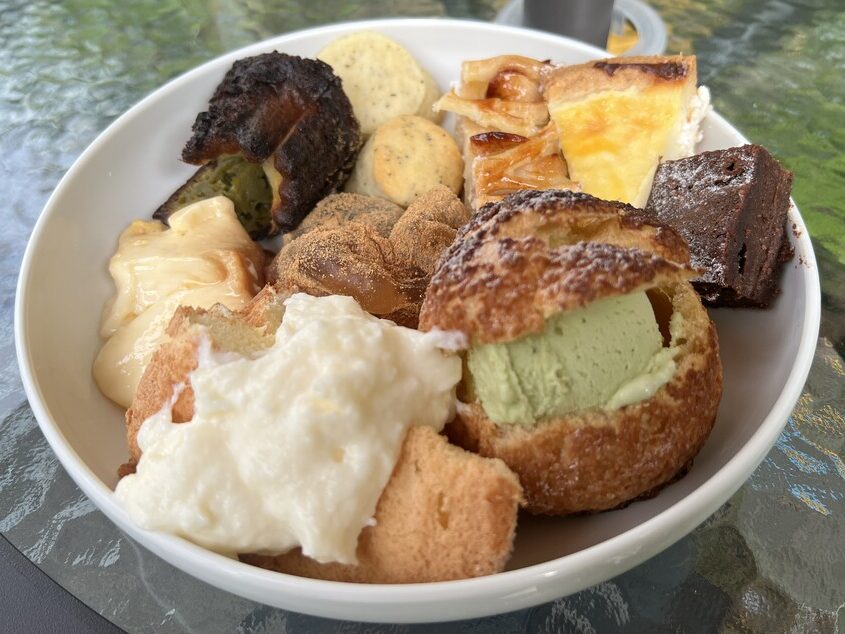 店内でスイーツやジェラートをお皿に取り、外のオープンカフェスペースでゆっくりいただける形式になっています。💛