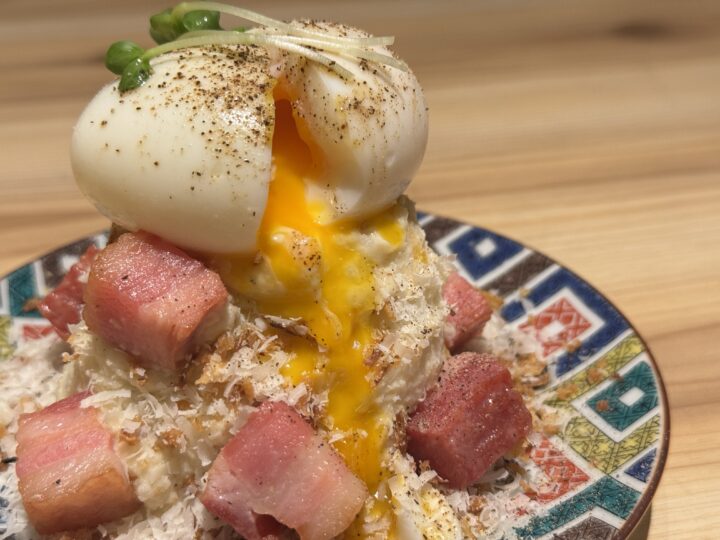 ポテトサラダにブロックベーコン、フライドオニオン、チーズ、そして半熟卵を乗せちゃうなんて・・・🤤