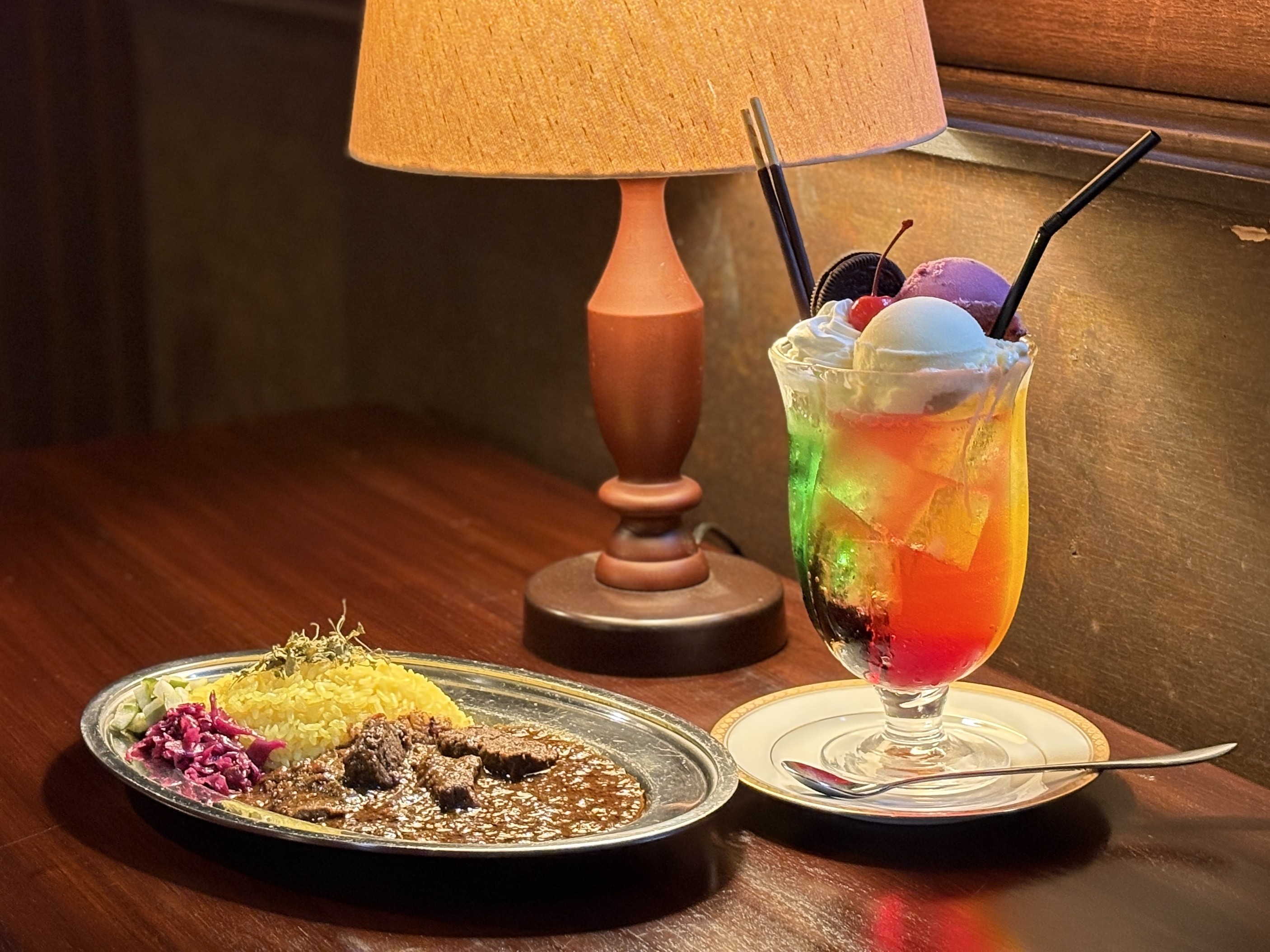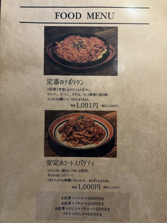 ランチタイム(11:00~14:00)には、カレーやナポリタンなどのフードメニューがあります。🍝