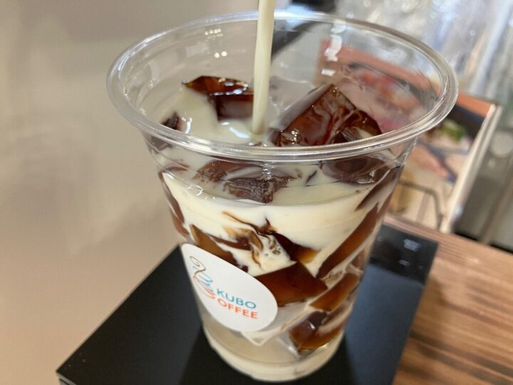 カフェインレスの手作りコーヒーゼリーがたっぷり入った甘めのドリンク。ほとんど苦みがなくとっても飲みやすいんです😲