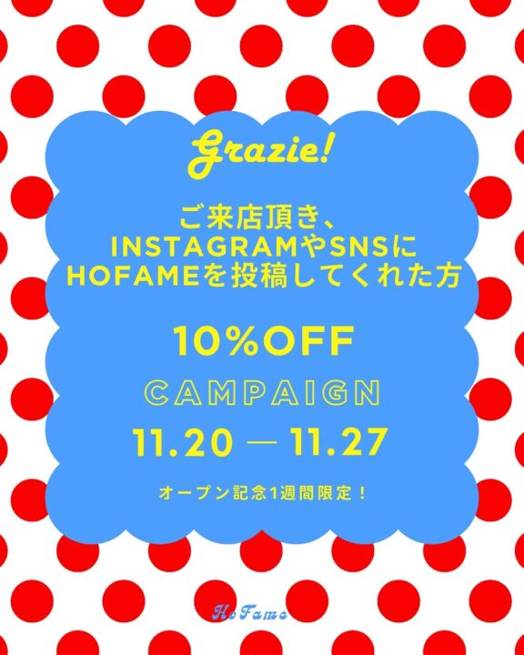 オープン記念として20日〜27日の1週間限定で、SNSに「Ho Fame(オファメ)」を投稿すると 10%OFF 🎉※投稿画面をスタッフに見せてください