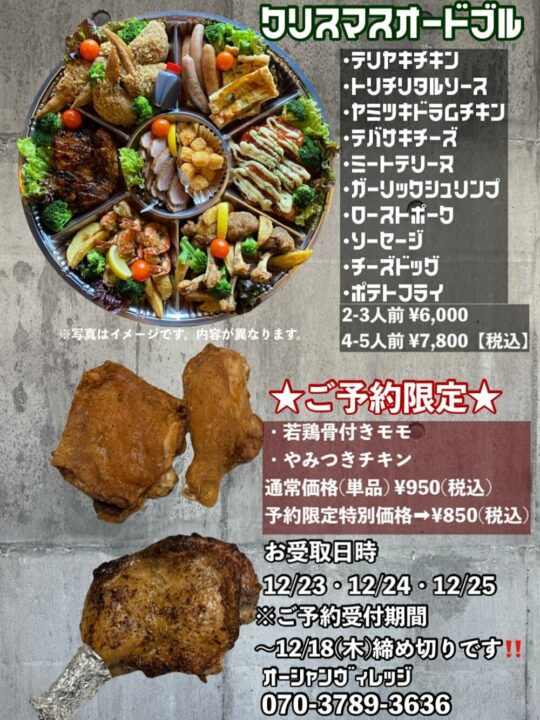 玉野市築港のダイニングバー「Ocean Village(オーシャン ビレッジ)」はクリスマスオードブルとチキンの予約を受け付けていますよ~!🎄🍗