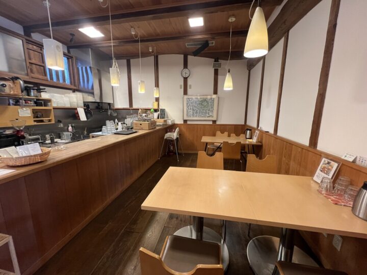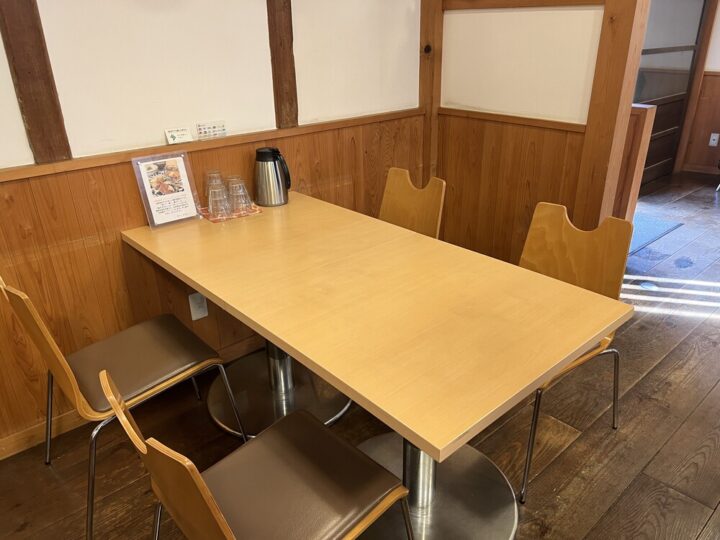 店内は、木を基調とした落ち着いた空間で、どの席もテーブル席になっています。