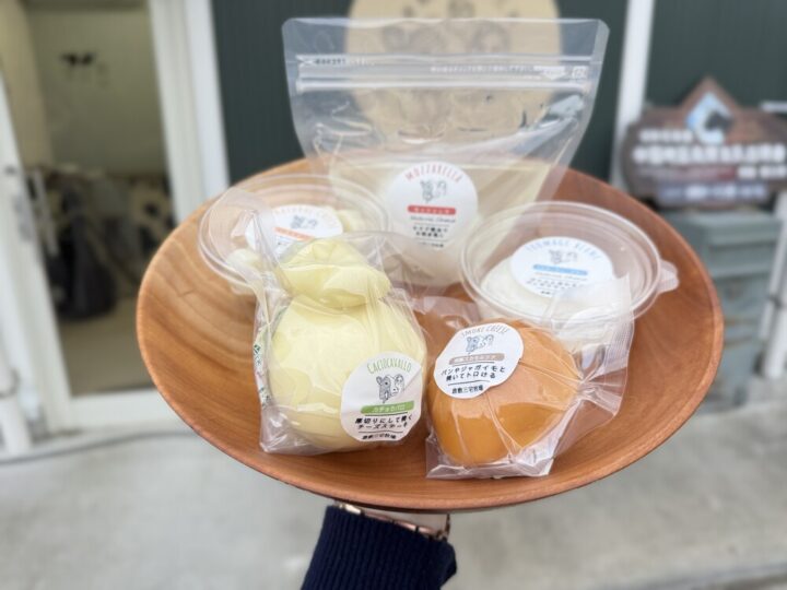 ●モッツァレラチーズ(写真上) ●燻製スカモルツァ(写真右下) ●フロマージュ・ブラン(写真右) ●おつまみチーズ(写真左) ●カチョカバロ(写真左下)