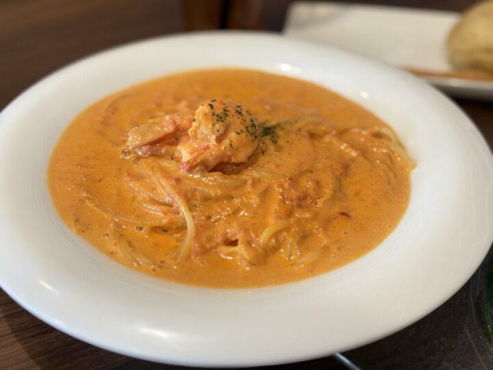 濃厚なトマトクリームのソースに海老の風味がしっかりと感じられます。