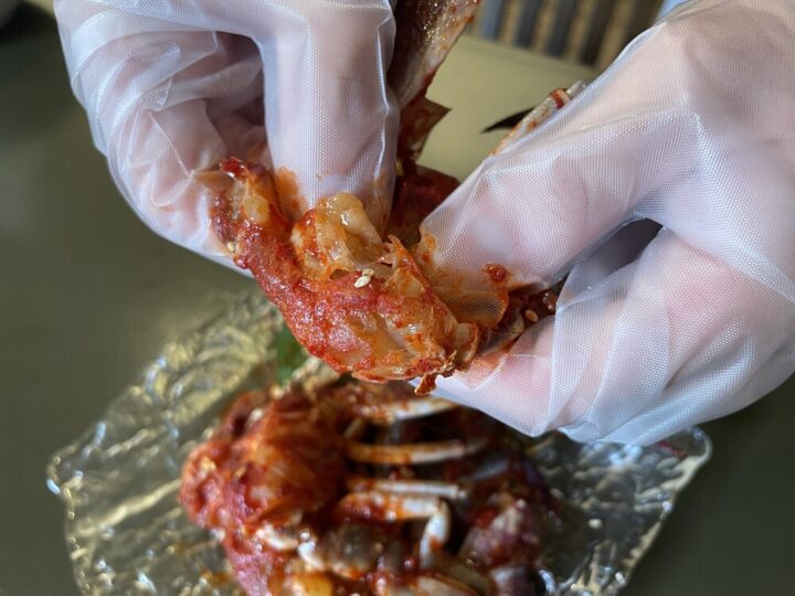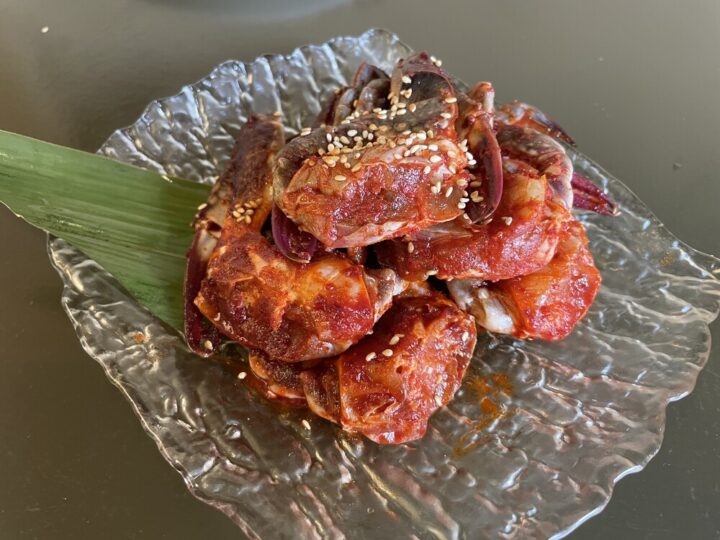 生のワタリガニをニンニクや玉ねぎなどの野菜と一緒に醤油ベースのたれに漬け込み熟成させたお料理なんです!ご飯との相性抜群で「ご飯泥棒」とも呼ばれるんだとか🤭