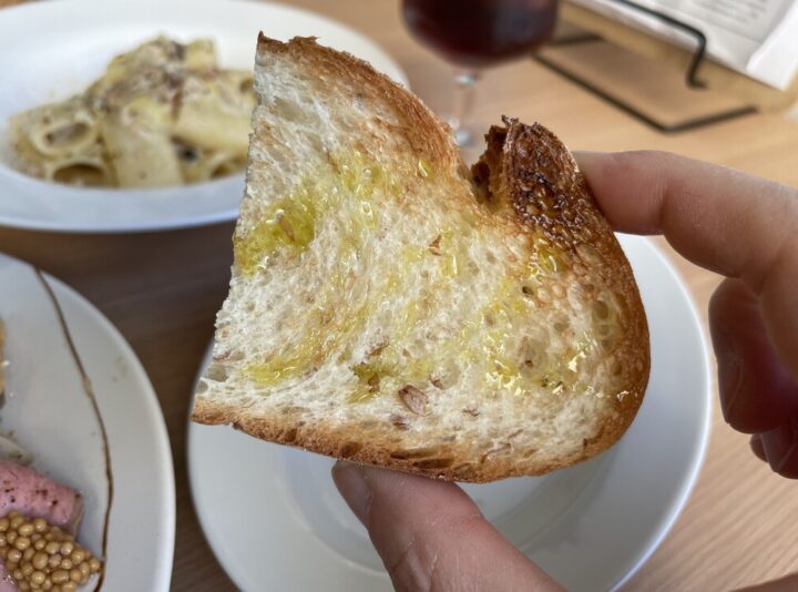 オリーブオイルのかかったライ麦パンが2つ!トーストされて外はパリッとしているんですが、中はやわらか~い😳ほんのり甘みのあるシンプルなパンでお料理にもよく合います!