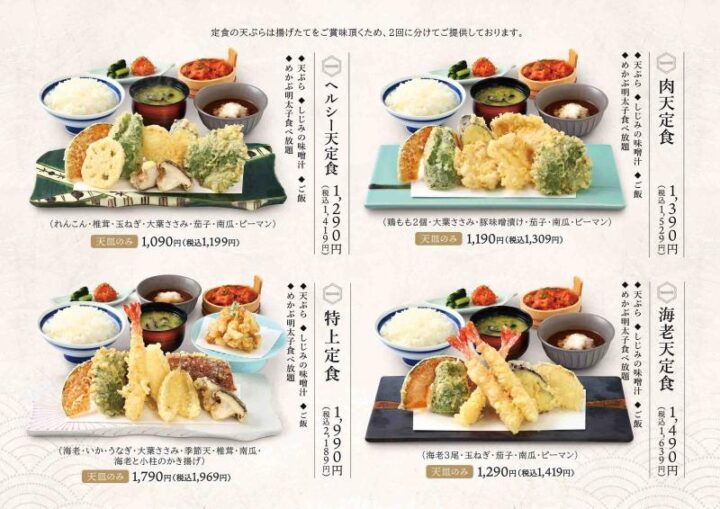 てんぷら一代といえば、海老・イカ・穴子・鶏もも・ナス・カボチャ・ピーマンなど7種類の天ぷらが楽しめる「一代定食」が看板メニュー😋