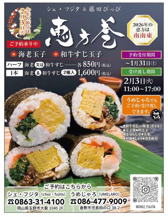 2026年2月3日(火)と4日(水)に倉敷市茶屋町で恵方巻きの販売を行います。