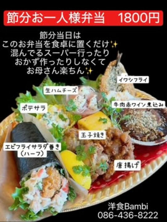 節分に合わせて、恵方巻きやおかずがセットになった「節分お一人様弁当」の予約を受け付けています。🍱