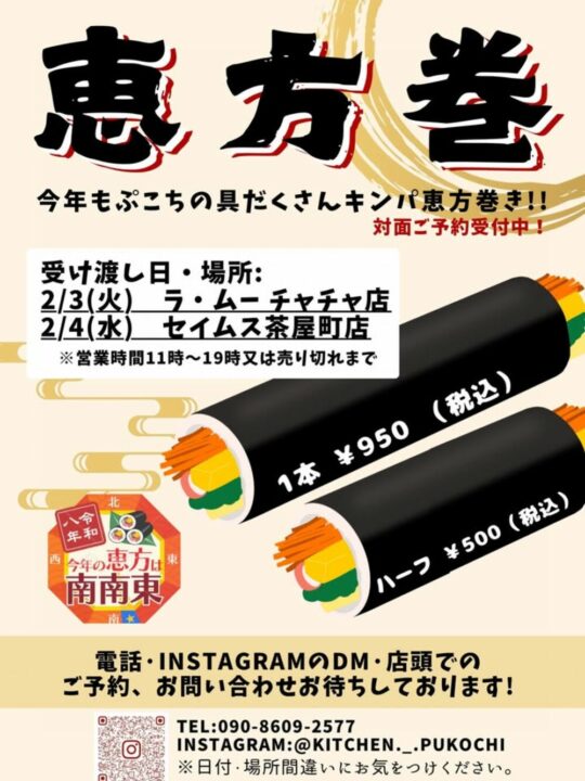 恵方巻きは韓国風のキンパで、1本とハーフサイズの2種類から大きさを選んで注文できます。✨
