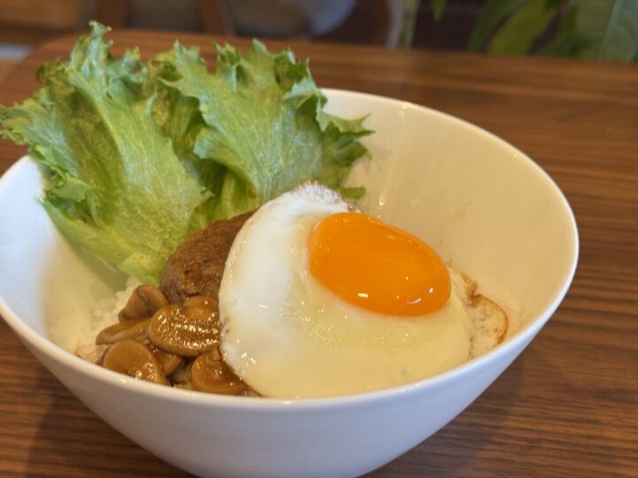 このロコモコにのっているハンバーグは児島の精肉店から仕入れた国産の牛豚を使ったひき肉を一つ一つ丁寧に手ごねされています😌