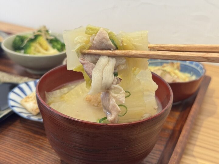 白菜と玉ねぎ、厚揚げ、えのき、豚肉が入っているそうで、栄養もたっぷり取れて体にいいですよね🌞