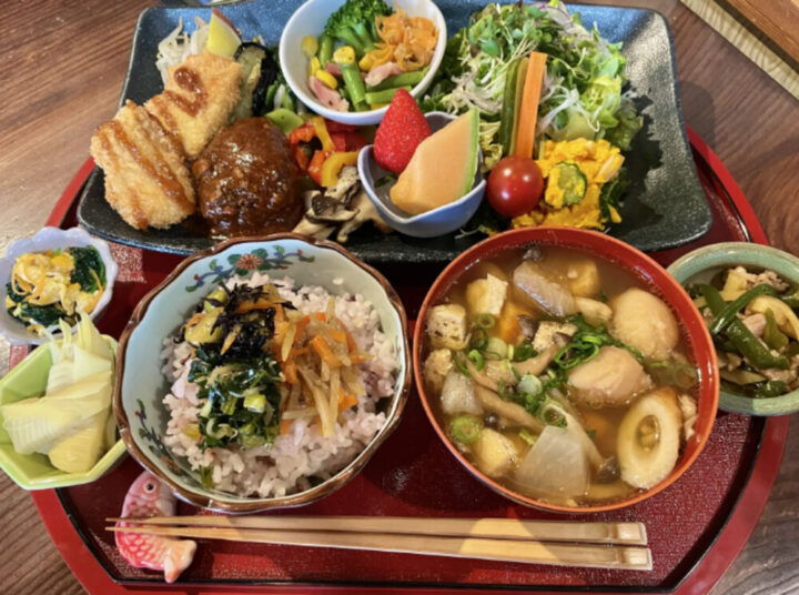 岡山の野菜を使った天ぷらやこんにゃく煮、あげ煮など、約20種類のおばんざいが毎日日替わりで並んでいて、身体にやさしい味付けがこれまた絶品🥰