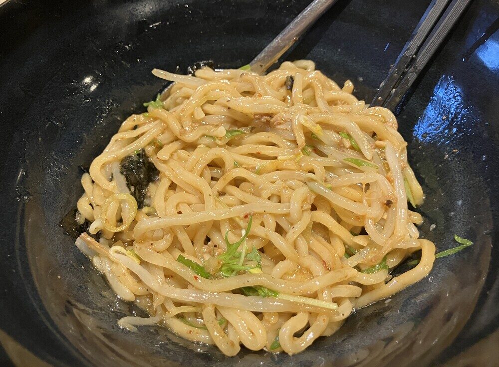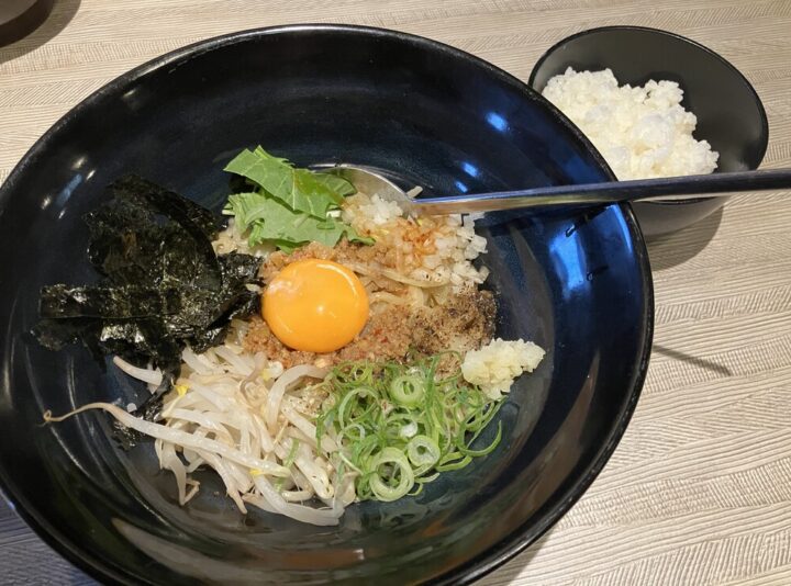 麺を食べ終えた後の器にごはんを投入して、ビビンバのようにして混ぜて食べるまでが「琥家のまぜそば」の楽しみ方!!🥢