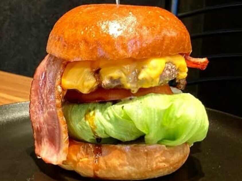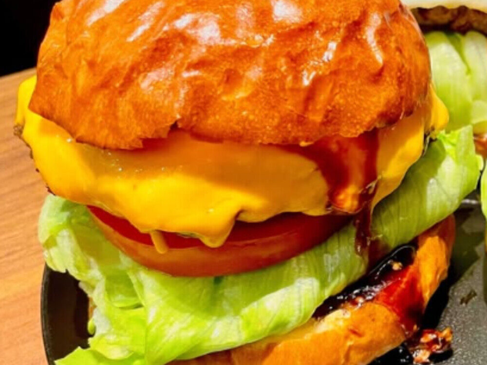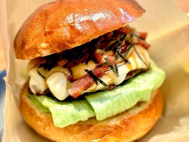 ベーコンがハンバーガーに垂れかかっているこの見た目のインパクトも人気の理由。SNS映えも間違いなし!!