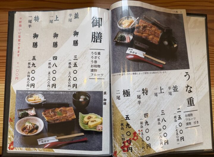 うな重にうなぎが半尾のった並(3850円)、一尾のった上(5280円)、一尾半のった特(6490円)から選べます。