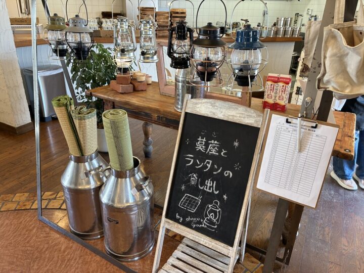 茣蓙ござとランタンを無料で借りることができて、アウトドア気分を味わえるんです!