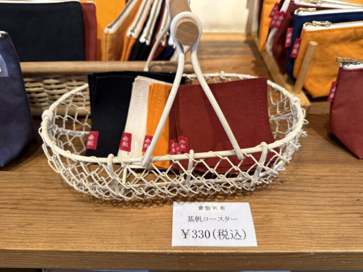 基帆コースターはJOBUに比べるとやや薄めの作りですが「倉敷帆布」の文字が入っているんです!色味もやや落ち着いた色合いで倉敷土産にぴったりですよ!