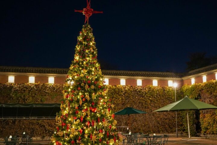 さらに、会場にはアイビースクエアのメタセコイヤの木を使用した5m越えのクリスマスツリーも飾られます。ツリーの装飾を手掛けたのは、装飾家の能勢聖紅さん。昨年のREDに今年はGOLDのカラーも加え、より一層華やかに装飾されています✨