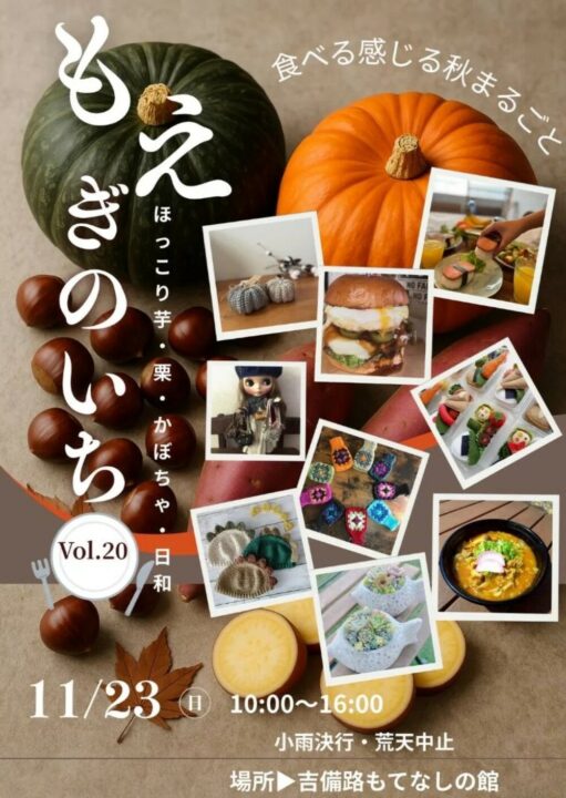 吉備路もてなしの館で11月23日に「もえぎのいちVol.20」が開催されます。