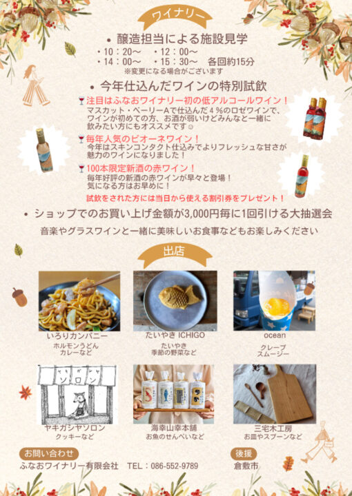 倉敷市船穂町にあるふなおワイナリーで「ワインと音楽のまつり」、が11月23日に開催されます✨
