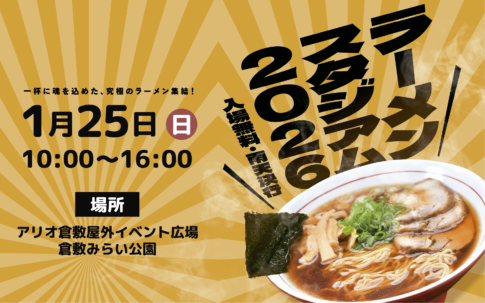 アリオ倉敷屋外イベント広場と倉敷みらい公園では、「ラーメンスタジアム」が初開催です!県内外から個性豊かなラーメン屋さんが20店舗集結!ラーメンにかかせない唐揚げや餃子のお店も出店しますよ~!