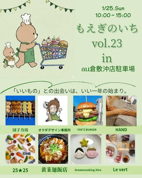 au倉敷沖店駐車場では、今年初の「もえぎのいち」が開催されます!今回もお団子屋さんやハンバーガーショップなどバラエティ豊かなお店が集まりますよ~!