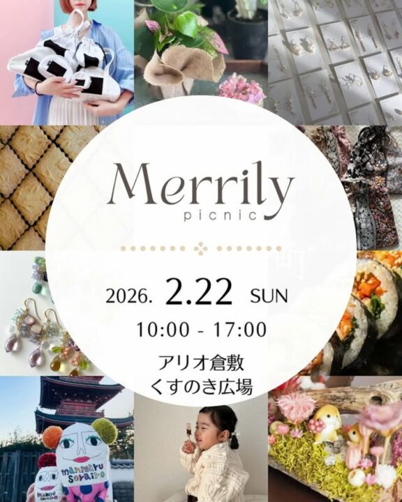 アリオ倉敷1階のくすのき広場で、ハンドメイド雑貨やアクセサリー、焼き菓子などが並ぶイベント「Merrily picnic」が開催されます!個性的で可愛い作品が盛りだくさん!あなたのお気に入りが見つかるかも⁉