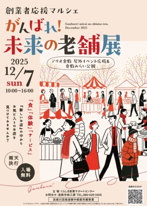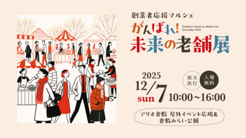 高梁川流域圏で創業前~創業後5年以内の“新しいお店”が集まるイベント「がんばれ!未来の老舗展」が12月7日に開催されます。グルメ、スイーツ、雑貨、体験など様々なジャンルのお店が集うので、ぜひお気に入りのお店を見つけに行ってみてくださいね~😊