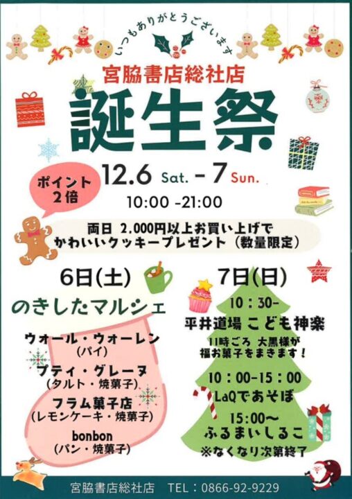 宮脇書店総社店で12月6日、7日に「誕生祭」が開催されます!この2日間は、2,000円以上のお買い上げでかわいいクッキーがもらえるそうですよ~♪また、6日には真備や総社の人気店によるマルシェ、7日にはこども神楽やLaQで遊ぶイベントなどが予定されています!