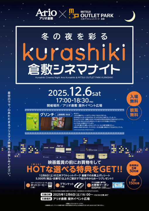 星空の下で、心あたたまるクリスマス映画「グリンチ」が上映されます。当日三井アウトレットパーク倉敷で5,000円以上購入したレシートを提示すると、コーヒーやブランケットなどあたたかいプレゼントがもらえるんだとか😳先着なのでゲットしたい方はお早めに!