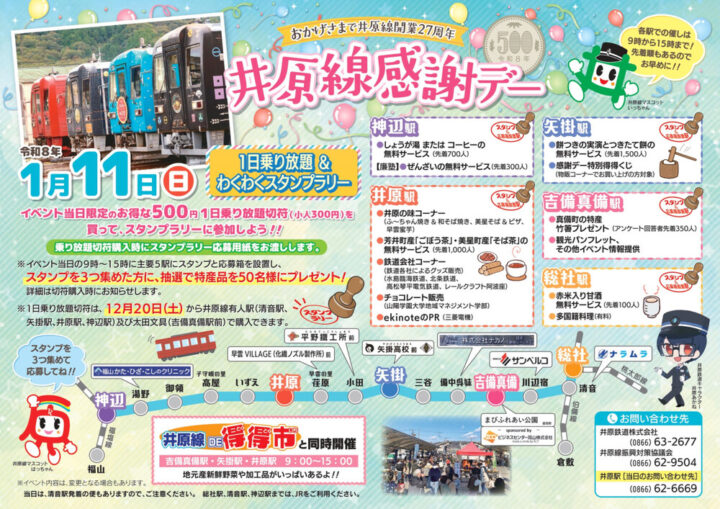 1月11日で27年目を迎える井原鉄道で、「井原線感謝デー」と題して1日乗り放題&わくわくスタンプラリーを開催します🚃この日はなんと500円で電車に乗り放題!9時~15時は各駅で催しも🎉スタンプラリーに参加すると抽選で特産品が当たるかも!?