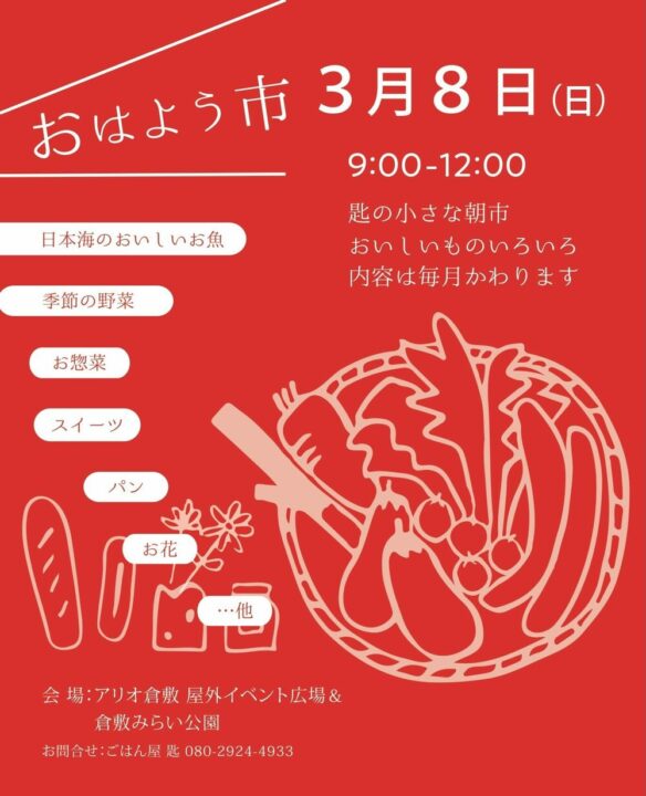 アリオ倉敷の屋外イベント広場&倉敷みらい公園で、毎月変わるおいしいものが集まるイベント「おはよう市」が3月8日開催されます!今回もこだわりのお店がたくさん出店!早起きして朝活を楽しんでみてはいかがでしょうか?