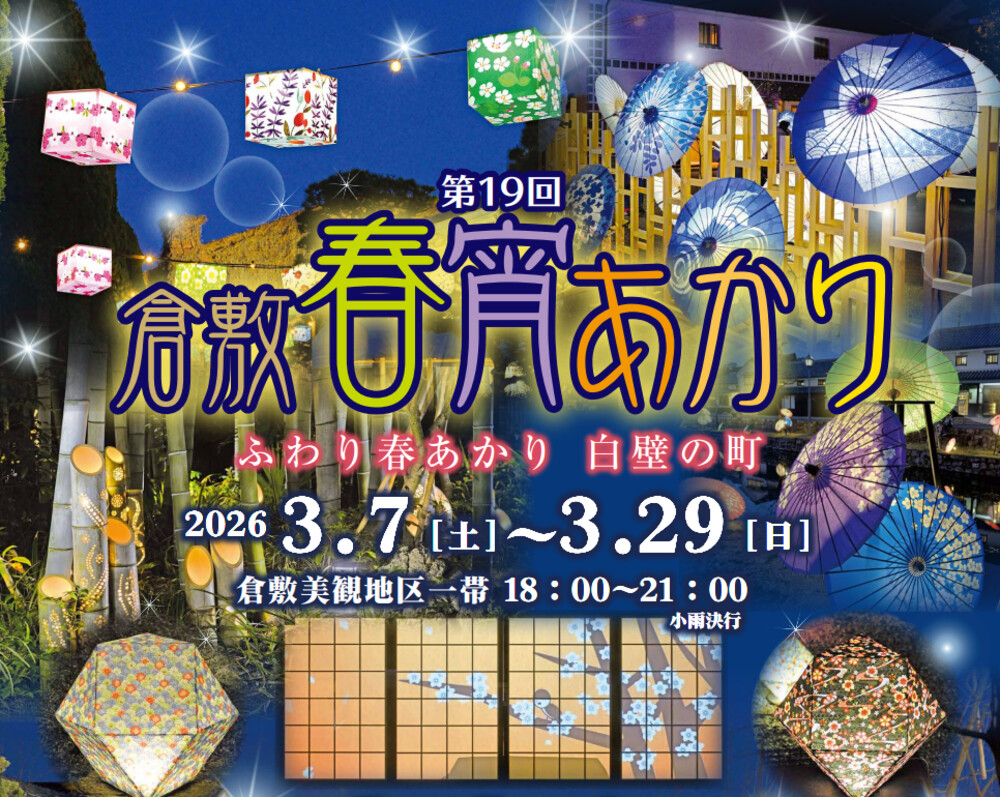 倉敷に春の訪れを告げるイベント「倉敷春宵あかり」が2026年3月7日~29日まで倉敷美観地区一帯で開かれます!今年で19回目を迎えた春の恒例イベントで、期間中は美観地区が優しいあかりに包まれ幻想的に彩られますよ~!