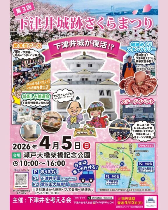 下津井の景色と桜を楽しめる「下津井城跡さくらまつり」が瀬戸大橋記念公園で開催されます!こちらもステージイベントのほか、定番のやきそばや、からあげ、牛串などの屋台が登場!場内花見スペースでゆっくり景色をながめながらお花見してみてはいかがでしょうか?