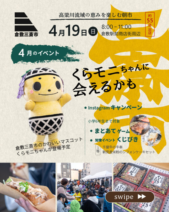 高梁川流域の特産品や加工品などが倉敷駅前商店街に集まります!「倉敷三斎市」が今月も開かれますよ~!今回も倉敷三レタスを使ったホットドッグや、下津井漁師のひじきごはんなどおいしいものが集まります!会場では倉敷三斎市のキャラクター「くらモ二ちゃん」に会えるかも!?
